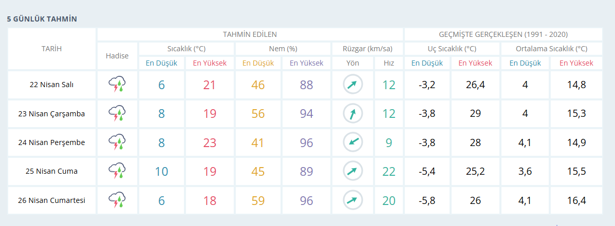Meteoroloji Genel Müdürlüğü’nün yayınladığı 5 günlük hava tahmin raporuna göre, Sivas’ta 22 Nisan Salı günü gök gürültülü sağanak yağış etkili olacak. Vatandaşların hem sabah hem de gün içinde bu hava koşullarına karşı dikkatli olması tavsiye ediliyor.