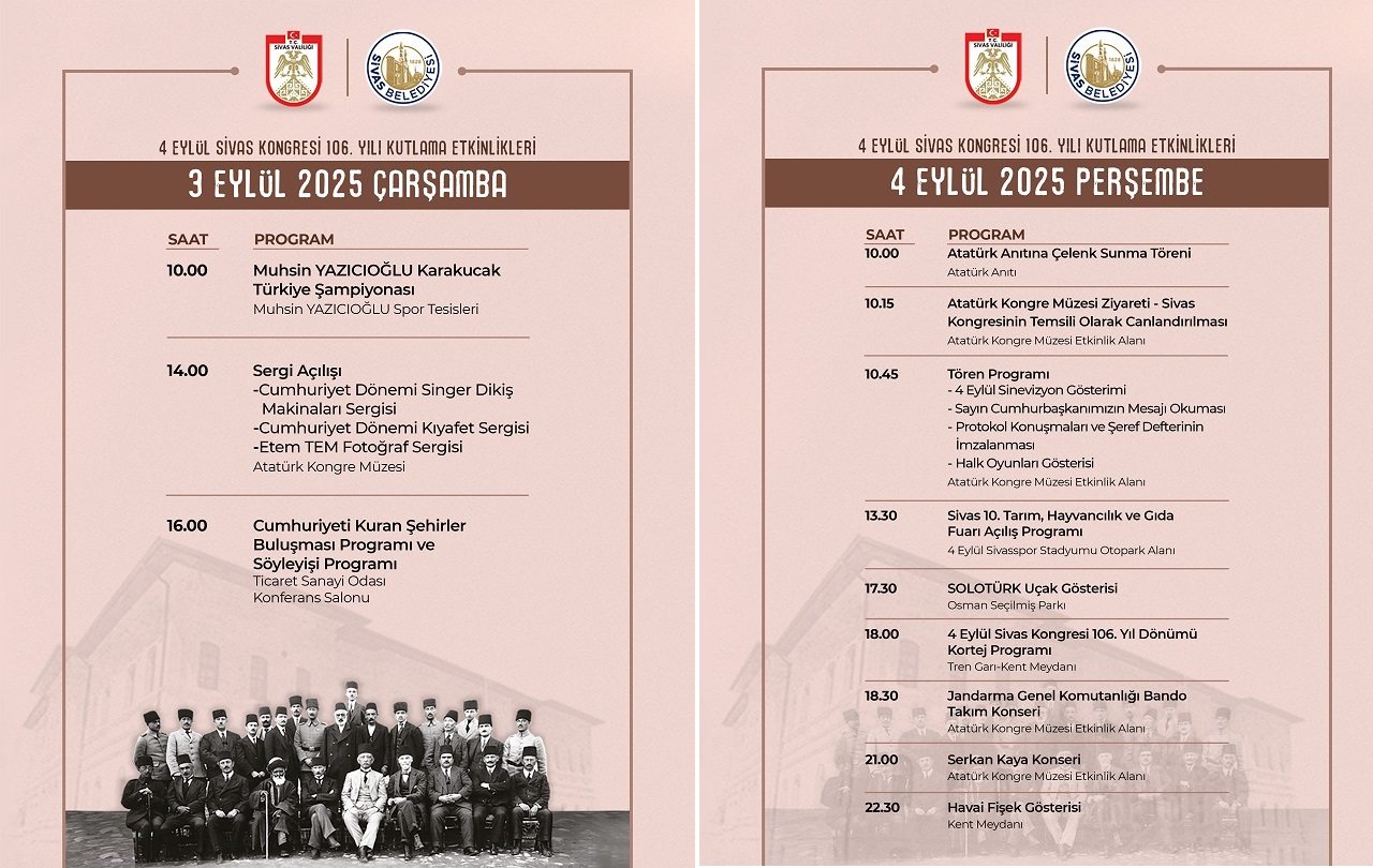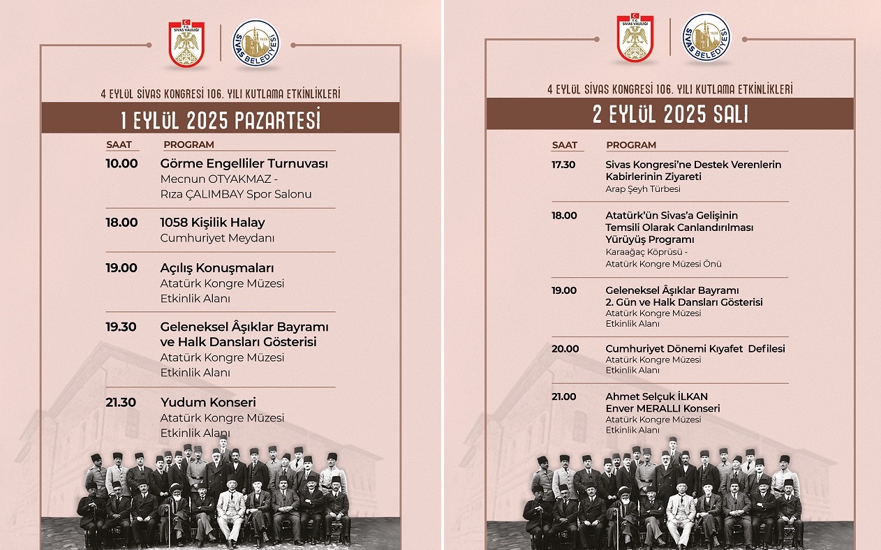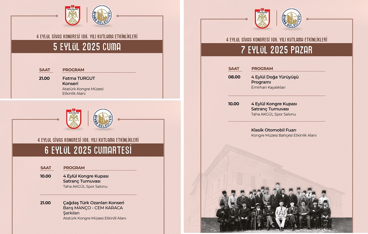 Sivas, Cumhuriyetimizin temellerinin atıldığı 4 Eylül Sivas Kongresi’nin 106. yıl dönümünü büyük bir coşkuyla kutlamaya hazırlanıyor. Sivas Valiliği’nin resmi sosyal medya hesabından yayımlanan mesajda, etkinliklerin 1–7 Eylül tarihleri arasında gerçekleştirileceği bildirildi.