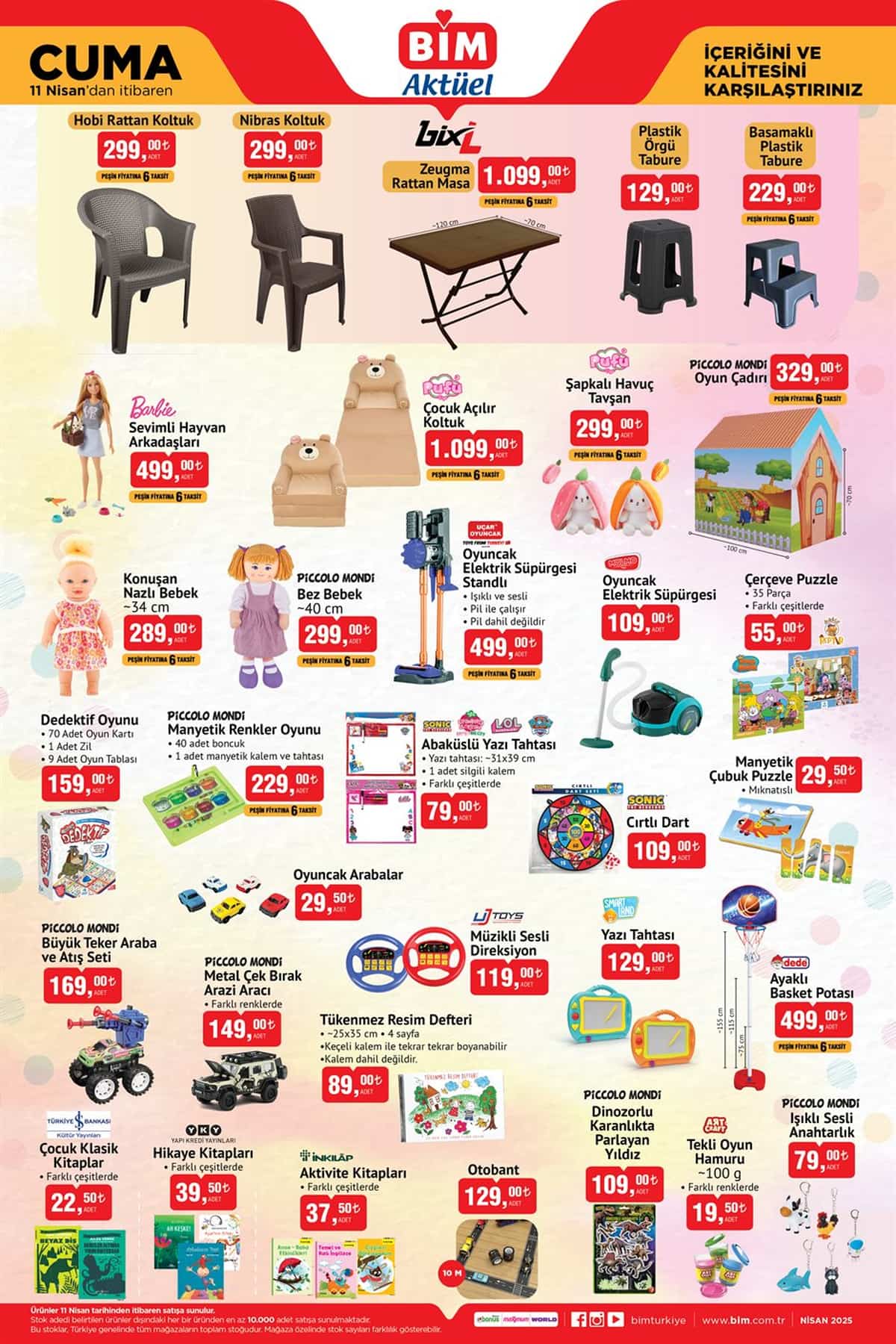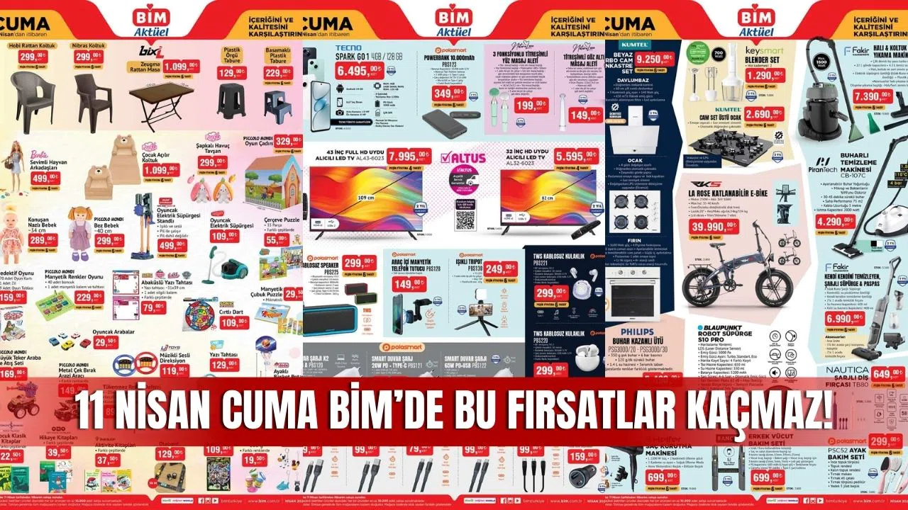 BİM, 11 Nisan 2025 Cuma günü itibarıyla geçerli olacak yeni aktüel ürünler kataloğunu duyurdu. 18 Nisan 2025 tarihine kadar sürecek kampanya kapsamında elektronik, kişisel bakım, ev eşyaları, züccaciye, mutfak, evcil hayvan ürünleri, tekstil ve oyuncak kategorilerinde birçok üründe cazip fırsatlar müşterileri bekliyor.