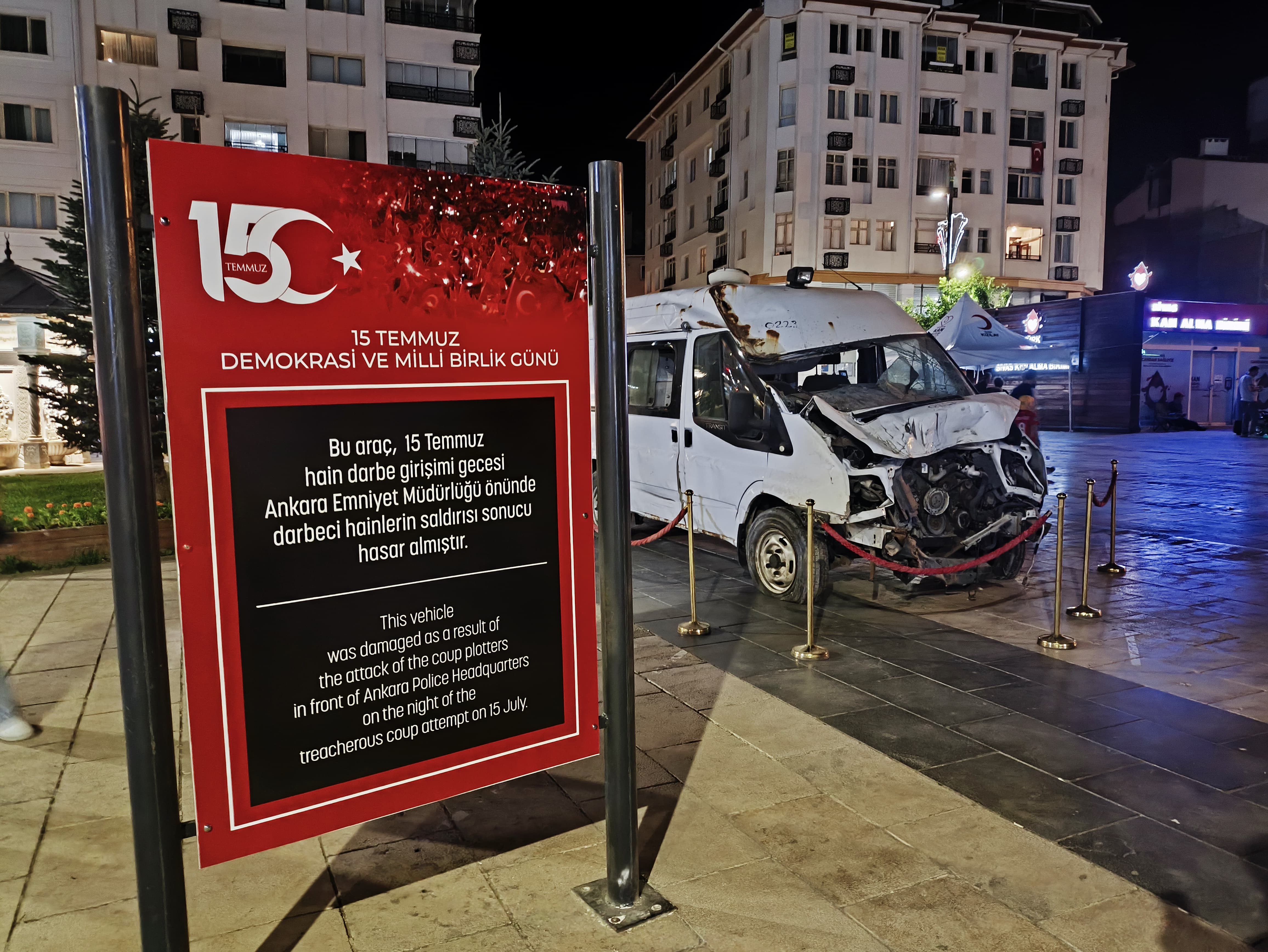 15 Temmuz Demokrasi ve Millî Birlik Günü yaklaşırken Sivas’ta anlamlı bir sergi vatandaşların ilgisine sunuldu. 2016 yılında Ankara Emniyet Müdürlüğü önünde darbeciler tarafından saldırıya uğrayan ve ağır hasar alan araç, Sivas kent meydanında sergilenmeye başlandı.