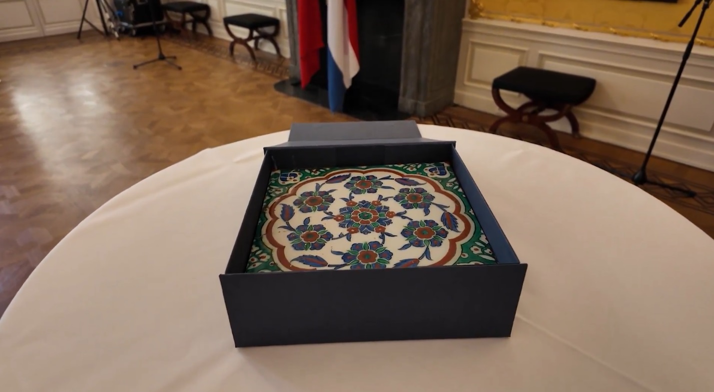 Görüşmenin ardından gerçekleşen teslim töreni, yıllar süren bir takibin de mutlu sonu oldu. 2005'te çalınan tarihi çininin, Hollanda'da bir müzayedede satıldığının tespit edilmesi üzerine Kültür ve Turizm Bakanlığı ile Dışişleri Bakanlığı tarafından girişimlerde bulunulduğu, ardından da Adalet Bakanlığı'nın hukuki süreci başlattığı belirtildi.