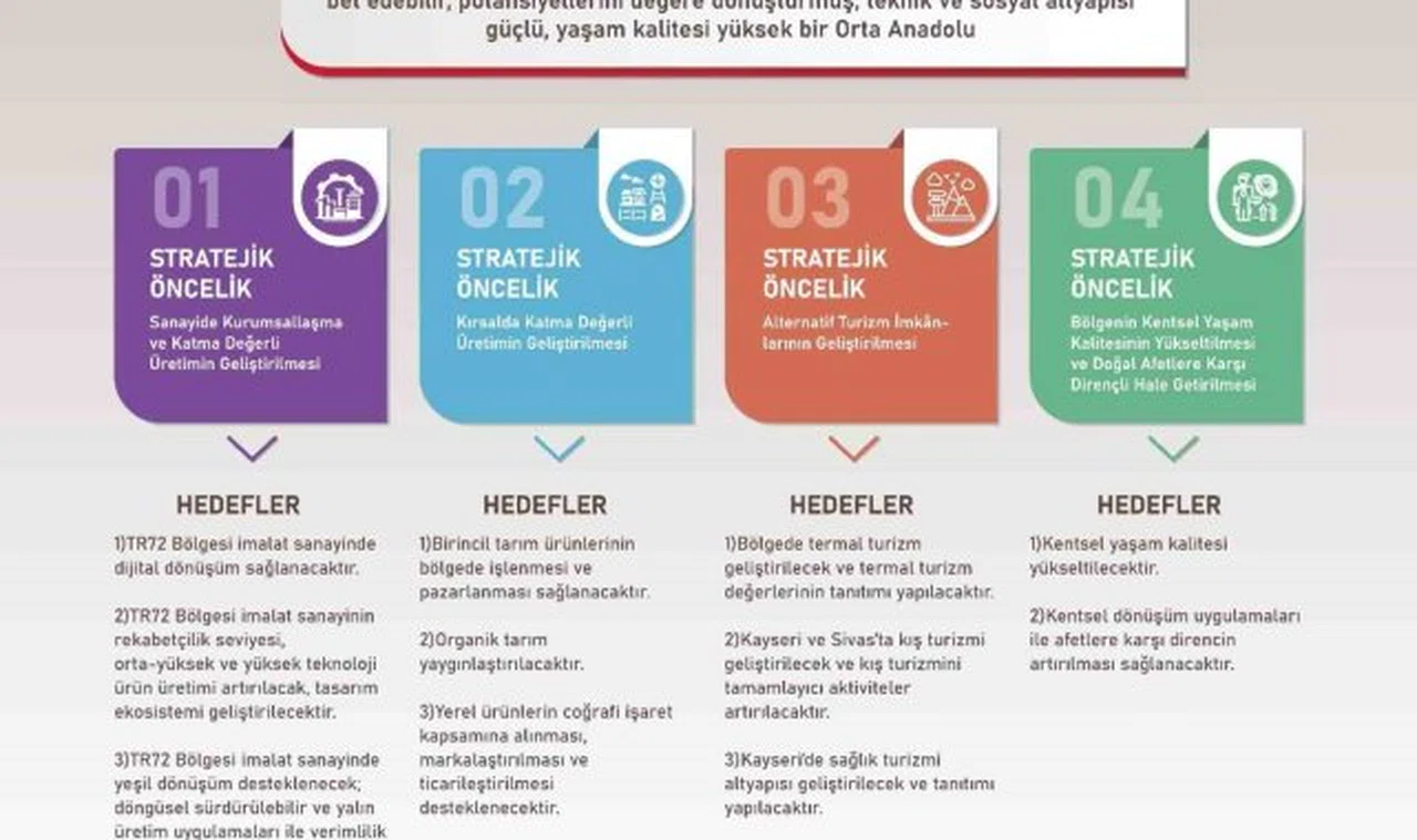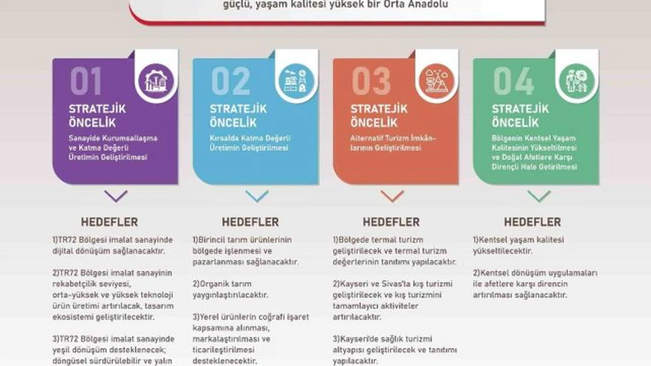 Kayseri, Sivas ve Yozgat illerini kapsayan 2024-2028 TR72 Bölge Planı, Orta Anadolu Kalkınma Ajansı tarafından tanımlanan vizyon istikametinde belirlenen stratejik öncelikler, hedefler, tedbirler ile proje ve program önerilerinin yer aldığı strateji belgesi olma özelliğini taşıyor. Bölgenin ekonomik, sosyal ve çevresel kalkınmasını desteklemek amacıyla oluşturulan kapsamlı bir yol haritası niteliğine olan 2027-2028 Bölge Planı'nda 'Beşerî ve sosyal sermayesini geliştirerek ulusal ve uluslararası düzeyde rekabet edebilir, potansiyellerini değere dönüştürmüş, teknik ve sosyal altyapısı güçlü, yaşam kalitesi yüksek bir Orta Anadolu' şeklinde belirlenen vizyon istikametinde 'Sanayide Kurumsallaşma ve Katma Değerli Üretimin Geliştirilmesi', 'Kırsalda Katma Değerli Üretimin Geliştirilmesi', 'Alternatif Turizm İmkânlarının Geliştirilmesi' ile 'Bölgenin Kentsel Yaşam Kalitesinin Yükseltilmesi ve Doğal Afetlere Karşı Dirençli Hale Getirilmesi' olarak 4 stratejik öncelik tanımlandı. Sanayide yüksek katma değerli üretime geçiş, tarımda modernizasyon ve verimlilik artışı, turizmde ise bölgenin kültürel ve doğal zenginliklerinin tanıtılması planın önemli hedefleri arasında yer alıyor. Ayrıca yeşil dönüşüm ve dijitalleşme süreçleri, bölgenin rekabet gücünü artırmak adına planın temel taşları olarak vurgulanıyor. Hazırlanma aşamasında katılımcılık ve şeffaflık ilkeleri ön planda tutulduğu 2024-2028 TR72 Bölge Planı'nda kamu kurumları, özel sektör temsilcileri, sivil toplum kuruluşları ve üniversitelerden gelen geri bildirimler ve 3 ilde yapılan çalıştayların sonuç raporları planın şekillenmesinde önemli rol oynadı. Stratejik öncelikler, hedefler, tedbirler ve bölgedeki sürdürülebilir büyümeyi teşvik ederken yerel dinamikleri ve ihtiyaçları dikkate alan proje ve program örneklerine yer verilen planın hazırlanması sürecinde ise tüm ilgili kurumların görüşü alınarak paydaşlarla işbirliği sağlandı.
