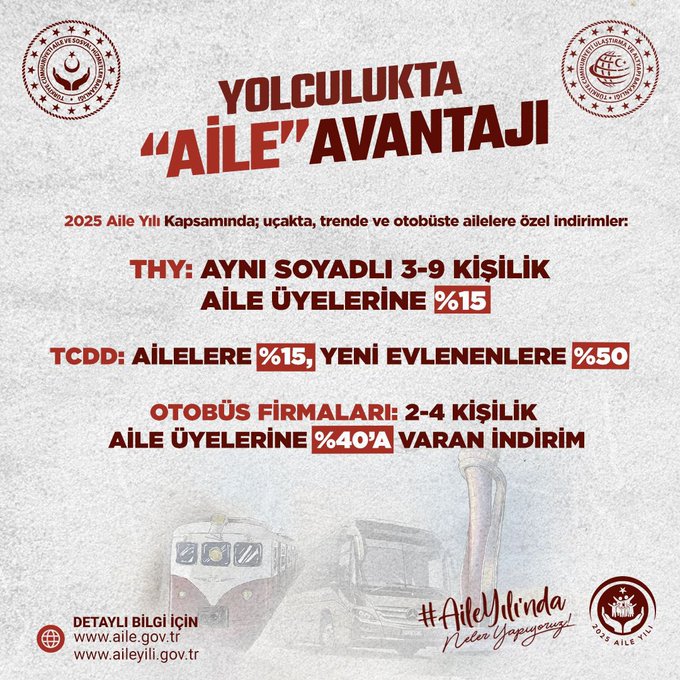 2025 Aile Yılı vesilesiyle başlatılan bu uygulama, ailece seyahat etmeyi hem kolaylaştırıyor hem de destekliyor. Detaylı bilgilere www.aile.gov.tr ve www.aileyili.gov.tr adreslerinden ulaşabilirsiniz.