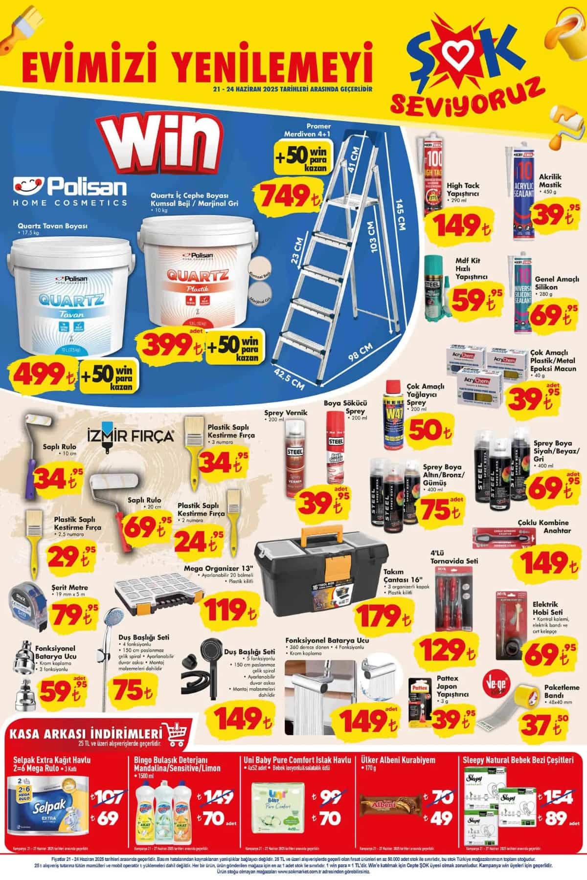 Şok 21 Haziran 2025 Aktüel Kataloğu'nun ilk sayfasında Polisan markalı ürünlerde hem uygun fiyat hem de +50 WinPara kazanma imkânı sunuluyor: