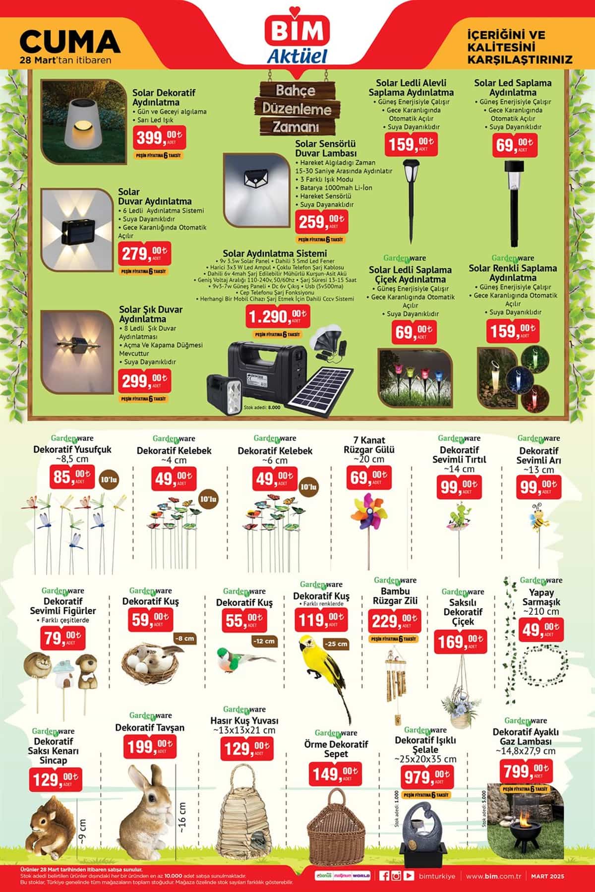 28 Mart 2025 Bim Kataloğu’nda bahçe eşyaları da büyük bir yer tutuyor. Erinöz 3 kişilik gölgelikli luka salıncağı 7,500 TL, Rimini oturma grubu ise 5 parçalı set olarak 7,999 TL fiyatla sunuluyor.