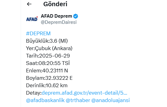 AFAD verilerine göre, 29 Haziran 2025 tarihinde Türkiye’nin iki farklı bölgesinde art arda meydana gelen depremler vatandaşlarda paniğe neden oldu. Biri Akdeniz açıklarında, diğeri ise Ankara’nın Çubuk ilçesinde kaydedilen depremler, bölgedeki sismik hareketliliği bir kez daha gündeme taşıdı.