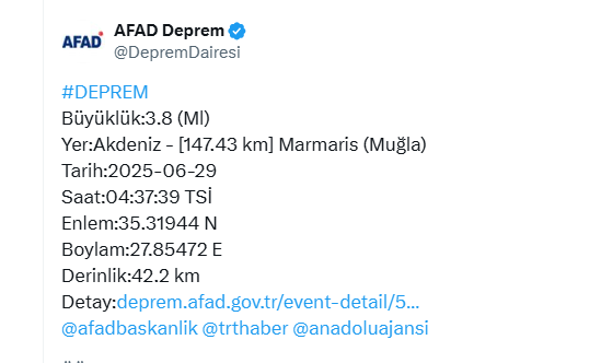 Sabaha karşı saat 04.37’de Akdeniz’de, Muğla’nın Marmaris ilçesine yaklaşık 147 kilometre uzaklıkta 3,8 büyüklüğünde bir deprem meydana geldi. AFAD’ın açıkladığı verilere göre, yerin 42,2 kilometre derinliğinde gerçekleşen sarsıntının, denizin açıklarında olması nedeniyle karada hissedilme şiddetinin düşük olduğu tahmin ediliyor. Depremin enlem koordinatı 35.31944 N, boylamı ise 27.85472 E olarak ölçüldü.