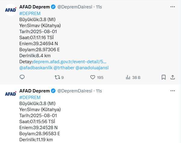 İlk depremin ardından yalnızca 40 saniye sonra, saat 07:17:56’da aynı bölgede ikinci bir deprem daha kaydedildi. Bu sarsıntının da büyüklüğü 3.8 olarak açıklandı. Ancak bu kez depremin yerin 11.19 kilometre derinliğinde gerçekleştiği belirtildi. Koordinatlar 39.24528 N enlem ve 28.96583 E boylam olarak paylaşıldı.