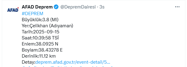 Adıyaman’ın Çelikhan ilçesinde sabah saatlerinde korkutan bir deprem meydana geldi. AFAD Deprem Dairesi verilerine göre sarsıntının büyüklüğü 3.8 (Mw) olarak kaydedildi.