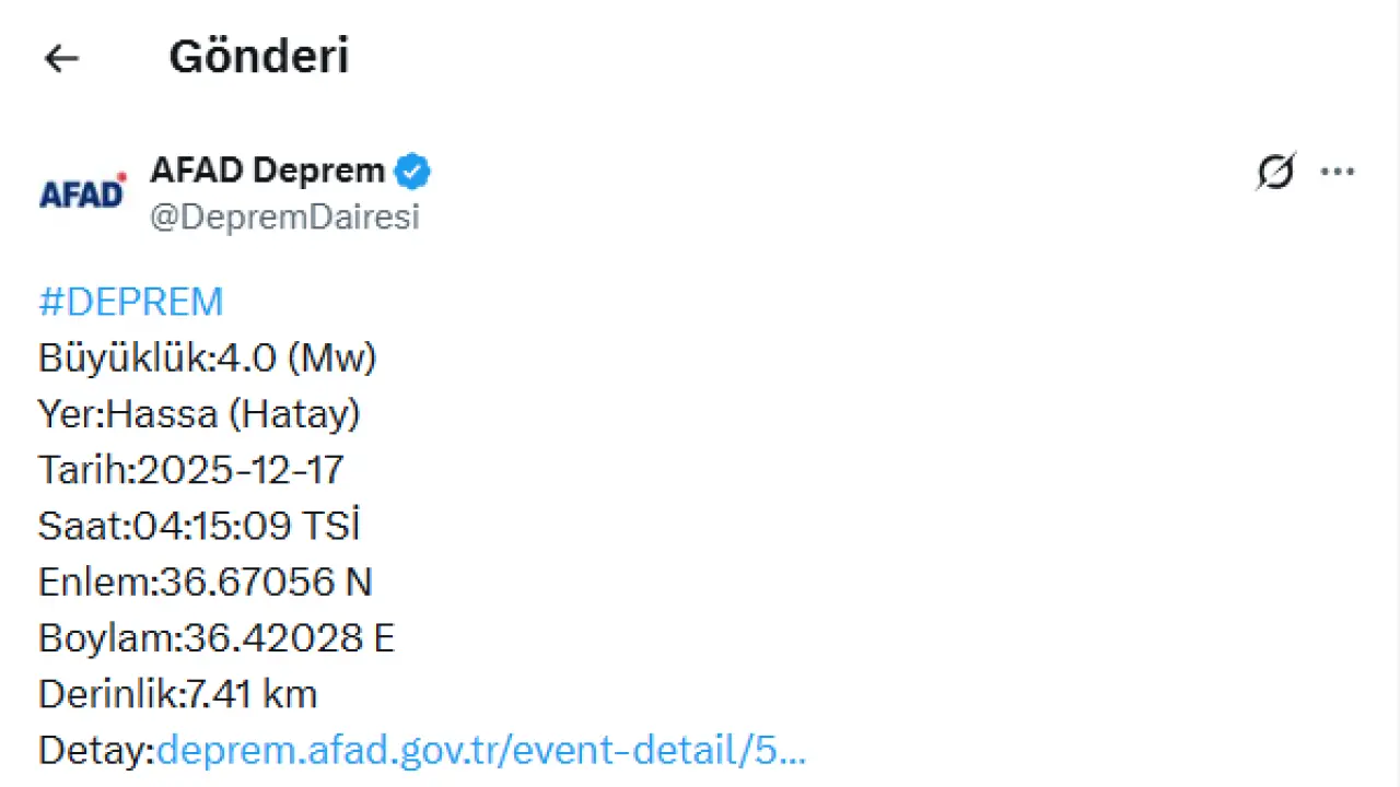 Afet ve Acil Durum Yönetimi Başkanlığı (AFAD) Deprem Dairesi tarafından yapılan açıklamada, depremin 17 Aralık 2025 tarihinde saat 04.15.09’da kaydedildiği bildirildi. Merkez üssü Hassa (Hatay) olan depremin yerin 7,41 kilometre derinliğinde gerçekleştiği açıklandı. Depremin koordinatları ise 36.67056 Kuzey enlemi ve 36.42028 Doğu boylamı olarak duyuruldu.