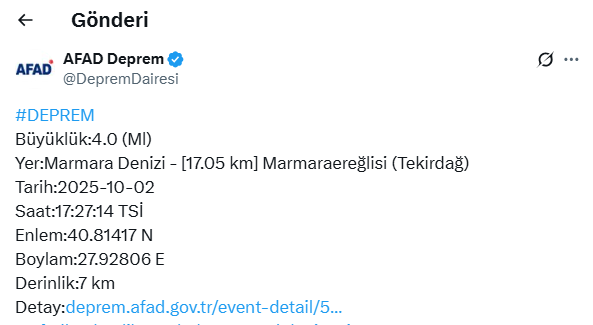 AFAD’ın aktardığı verilere göre, Marmara Denizi’nde 4,0 büyüklüğünde deprem meydana geldi. Deprem, Tekirdağ’ın Marmaraereğlisi ilçesine yaklaşık 17 kilometre mesafede kaydedildi.