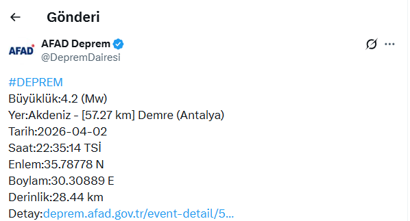 Akdeniz açıklarında meydana gelen 4,2 büyüklüğündeki deprem kısa süreli paniğe neden oldu. Afet ve Acil Durum Yönetimi Başkanlığı (AFAD) tarafından paylaşılan verilere göre, sarsıntı Antalya’nın Demre ilçesine yaklaşık 57 kilometre uzaklıkta kaydedildi.