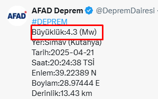 Afet ve Acil Durum Yönetimi Başkanlığı (AFAD) tarafından yapılan açıklamaya göre, Kütahya’nın Simav ilçesinde 4.3 büyüklüğünde bir deprem meydana geldi. Yerel saatle hissedilen sarsıntı, halk arasında kısa süreli paniğe neden oldu. Depremin yerin 13.43 kilometre derinliğinde gerçekleştiği belirtildi.
