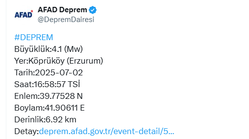 İkinci deprem ise aynı gün saat 16.58'de Erzurum’un Köprüköy ilçesinde gerçekleşti. AFAD'ın verilerine göre depremin büyüklüğü 4.1 olarak ölçülürken, derinliği ise 6.92 kilometre olarak açıklandı. Köprüköy ve çevre köylerde hissedilen sarsıntı, kısa süreli paniğe neden oldu. Bölgedeki vatandaşlar depremi net bir şekilde hissettiklerini belirtirken, herhangi bir olumsuzluk yaşanmadığı bildirildi.