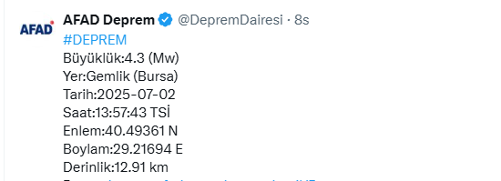 İlk deprem, saat 13.57’de Bursa’nın Gemlik ilçesinde meydana geldi. AFAD verilerine göre yerin 12.91 kilometre derinliğinde oluşan sarsıntı, 4.3 büyüklüğünde kaydedildi. Gemlik ve çevresindeki birçok ilçede hissedilen deprem, vatandaşları korkuttu. Şu ana kadar herhangi bir can veya mal kaybı bildirilmedi ancak yetkililer olası artçılara karşı dikkatli olunması konusunda uyarıda bulundu.