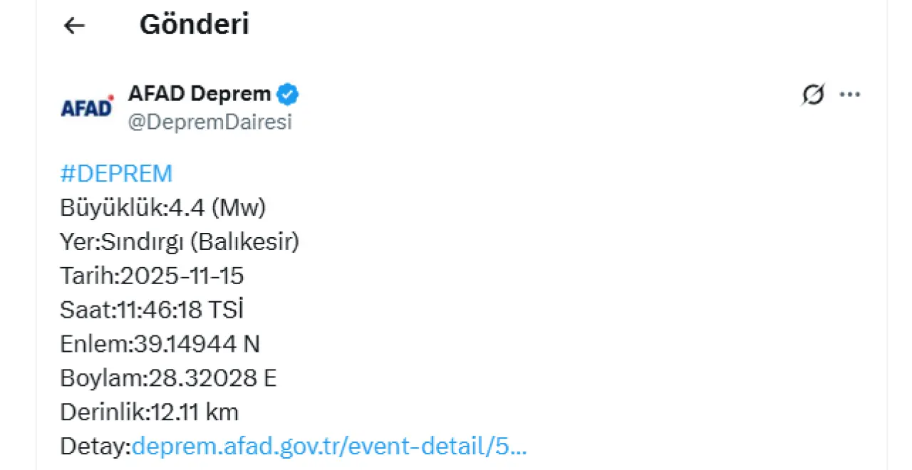 AFAD tarafından paylaşılan verilere göre Balıkesir’in Sındırgı ilçesinde 4,4 büyüklüğünde korkutan bir deprem meydana geldi. 15 Kasım 2025 tarihinde, saat 11:46:18’de kaydedilen sarsıntı bölge halkında kısa süreli paniğe neden oldu. Depremin yerin 12,11 km derinliğinde gerçekleştiği bildirildi.