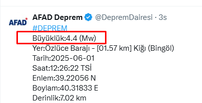 AFAD’ın paylaştığı bilgilere göre, Bingöl’ün Kiğı ilçesine bağlı Özlüce Barajı yakınlarında 4,4 büyüklüğünde bir deprem meydana geldi. Deprem 1 Haziran 2025 tarihinde kaydedildi. Sarsıntının yerin 7,02 kilometre derinliğinde gerçekleştiği ve koordinatlarının enlem 39.22056 N, boylam 40.31833 E olduğu açıklandı.
