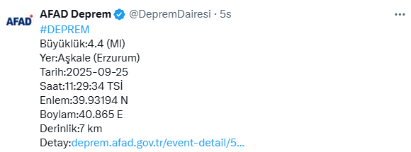 Erzurum’un Aşkale ilçesinde bugün meydana gelen deprem vatandaşları tedirgin etti. Afet ve Acil Durum Yönetimi Başkanlığı (AFAD) tarafından yapılan açıklamaya göre, sarsıntı 25 Eylül 2025 tarihinde saat 11.29’da kaydedildi. Depremin büyüklüğü 4,4 (Ml) olarak ölçülürken, yerin 7 kilometre derinliğinde gerçekleştiği bildirildi.