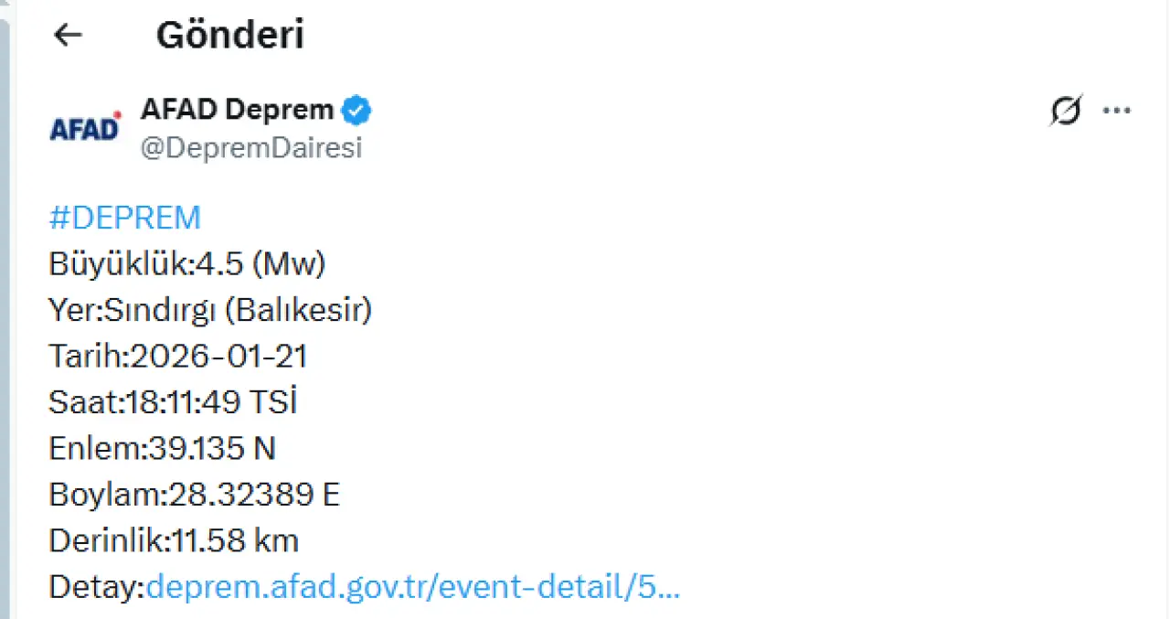 Afet ve Acil Durum Yönetimi Başkanlığı (AFAD), Balıkesir’in Sındırgı ilçesinde 4,5 (Mw) büyüklüğünde bir depremin meydana geldiğini açıkladı. Korkutan deprem, 21 Ocak 2026 tarihinde saat 18.11.49 TSİ’de kaydedildi.