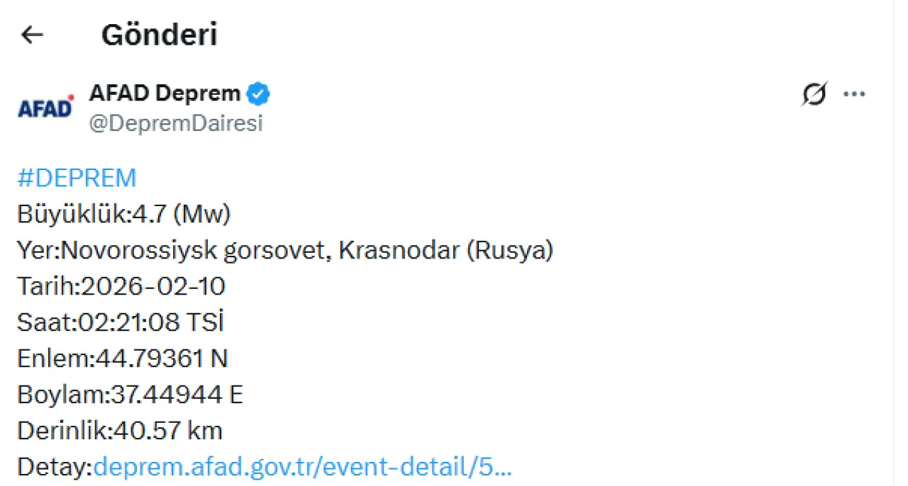 AFAD, resmi X (eski Twitter) hesabı üzerinden yaptığı paylaşımla 4,7 büyüklüğünde bir depremin meydana geldiğini duyurdu. Açıklamaya göre sarsıntı, Rusya’nın Krasnodar bölgesine bağlı Novorossiysk civarında kaydedildi.