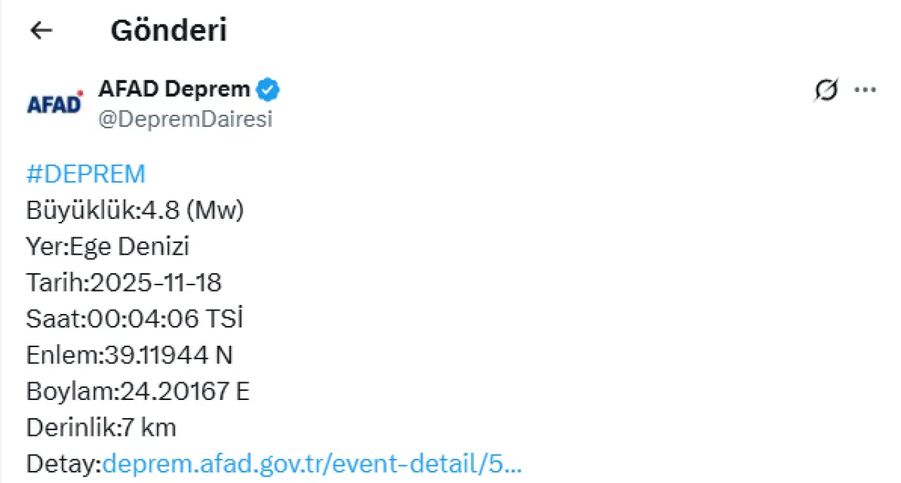 Afet ve Acil Durum Yönetimi Başkanlığı (AFAD), Ege Denizi'nde 4,8 büyüklüğünde bir deprem meydana geldiğini duyurdu.