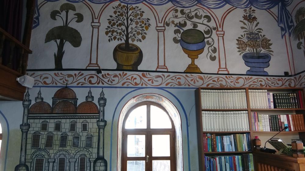 Caminin iç duvarlarında kök boya ve yumurta akı kullanılarak resmedilen cennet meyveleri, Tuğba Ağacı, hurma ağaçları, cennetin 8 kapısı ve Kabe tasvirleri, sanat eseri niteliğindeki süslemeleriyle dikkat çekiyor.