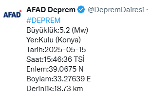 Afet ve Acil Durum Yönetimi Başkanlığı (AFAD) tarafından yapılan açıklamaya göre, depremin merkez üssü Konya’nın Kulu ilçesinde yer aldı. Yer sarsıntısının yerin yaklaşık 18.73 kilometre derinliğinde gerçekleştiği belirlendi. İlk incelemelere göre deprem nedeniyle herhangi bir can kaybı veya ciddi hasar yaşanmadı.