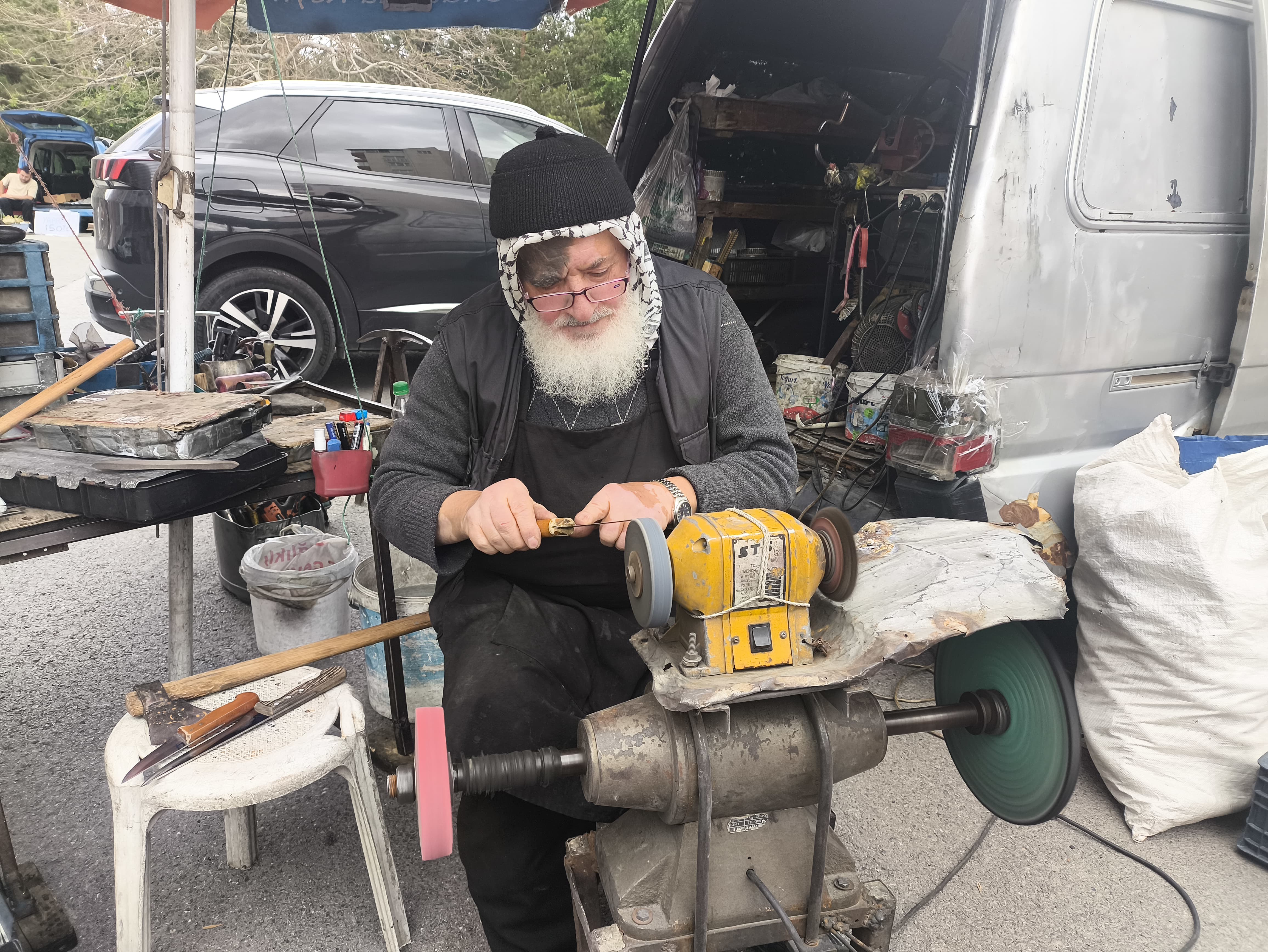 Muhammed Dede ile Kurban Bayramı öncesi Pazartesi Pazarı’nda tezgâhının başında karşılaşıldı. Elindeki eski bir bıçağı ustalıkla bileyleyen İdikçal, yıllara meydan okuyan bir dirençle mesleğini sürdürüyor.