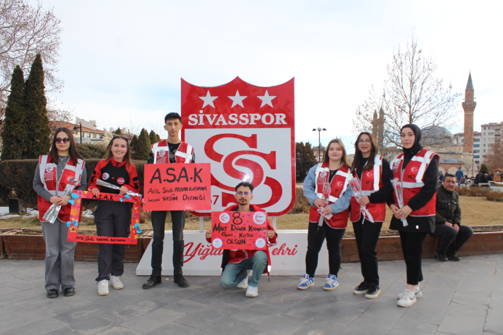 Sivas'ın kalbinde yer alan ve şehrin en önemli sembollerinden biri haline gelen Sivasspor arması, her dönem olduğu gibi bugün de ilgi odağı oldu. 8 Mart Dünya Kadınlar Günü'nde, Acil Sivil Arama Kurtarma ve İnsani Yardım Derneği üyeleri, Kent Meydanı'ndaki bu özel simgenin önünde bir araya gelerek fotoğraf çekindi.