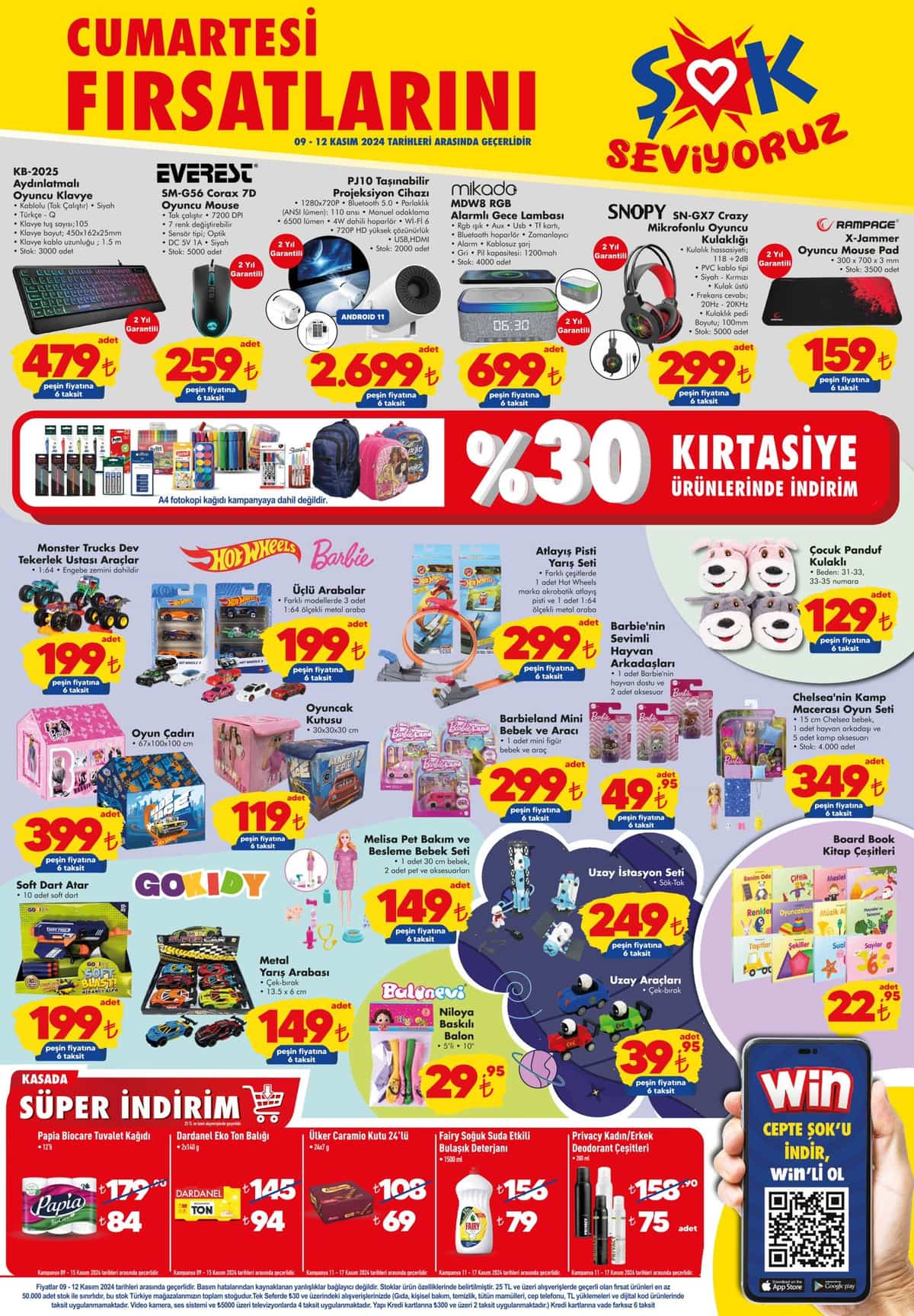 Şok Market, 9 Kasım 2024 Cumartesi günü başlayacak ve 16 Kasım 2024'e kadar sürecek yeni hafta sonu kataloğunu müşterileriyle buluşturuyor. "Hem Şok'ta Hem de Cepte Şok'ta" geçerli olan bu özel kampanyada, teknoloji ürünlerinden beyaz eşya ve oyuncaklara, kişisel bakım ve mutfak gereçlerine kadar pek çok kategoride indirimli ürünler yer alıyor.