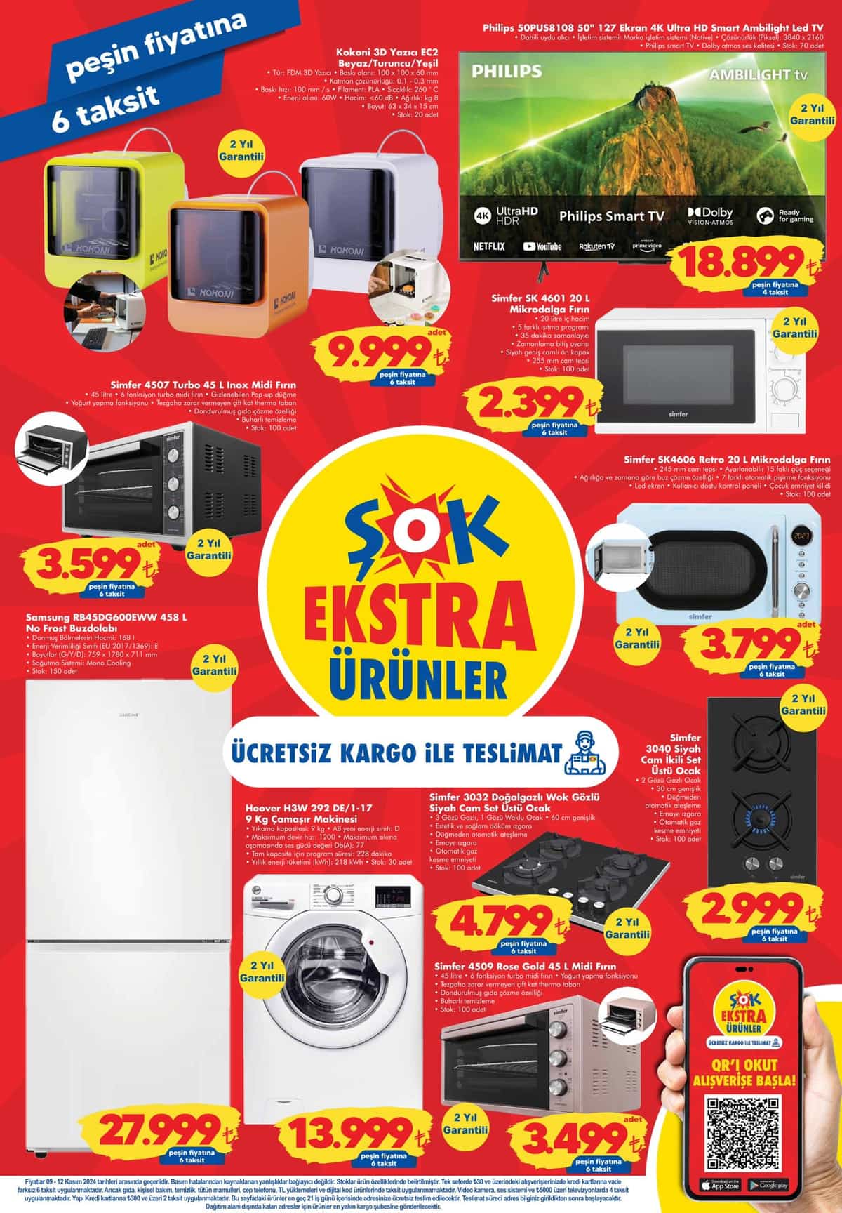 Philips, Samsung ve Hoover gibi markalardan 2 yıl garantili beyaz eşyalar da bu hafta Şok"ta yer alıyor. Philips 50” 4K Ultra HD Ambilight Led TV 18,999 TL, Samsung 458 Litre No Frost Buzdolabı 27,999 TL, Hoover 9 Kg Çamaşır Makinesi ise 13,999 TL"den satışa sunuluyor. Şık tasarımı ve yüksek performansıyla dikkat çeken Simfer 4507 Turbo 45 L Inox Midi Fırın 3,599 TL ve mikrodalga özelliğiyle Simfer SK 4601 20 L Mikrodalga Fırın 2,399 TL"den alıcılarını bekliyor.