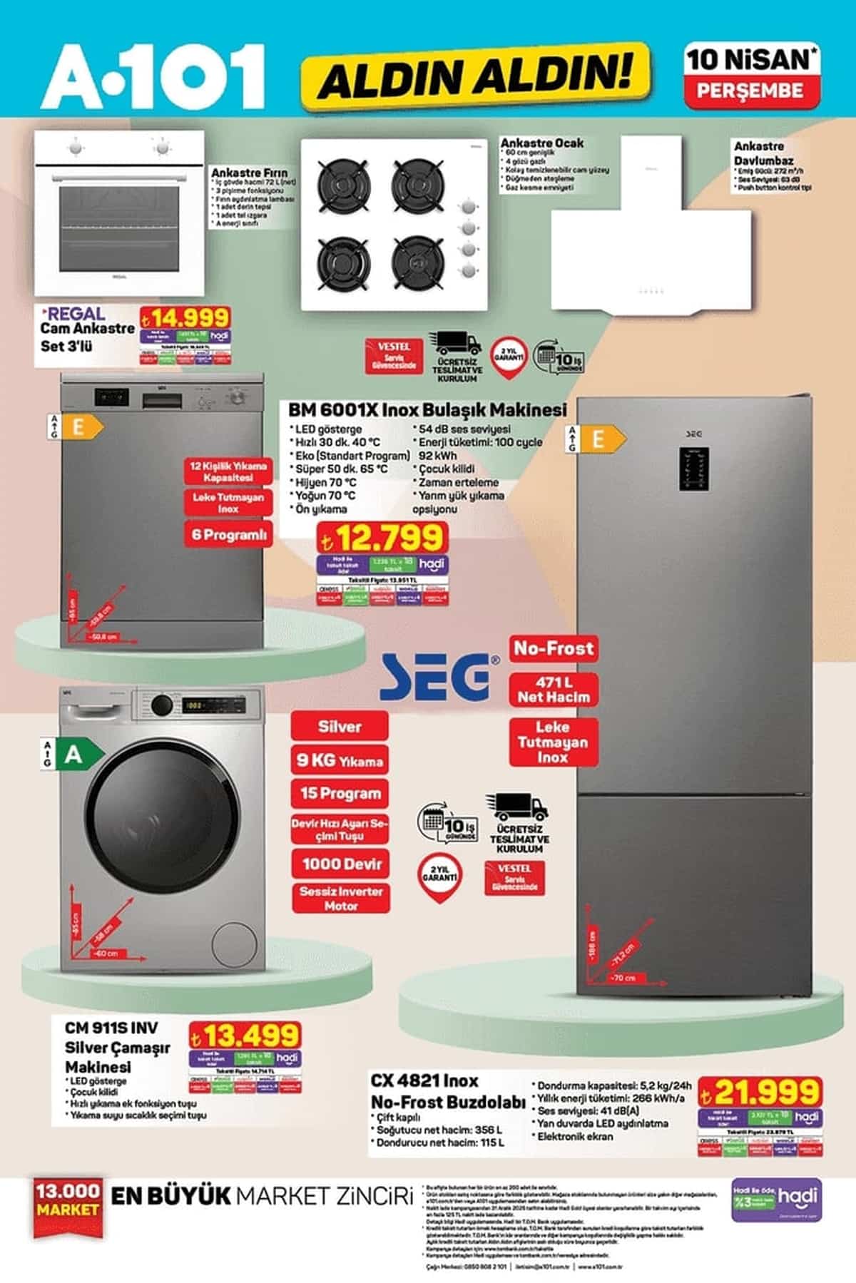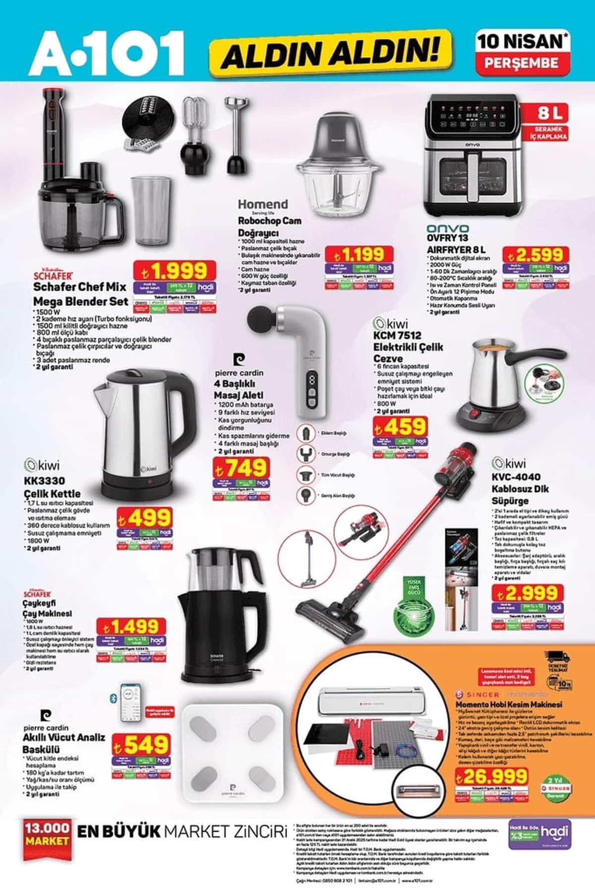 Samsung Cyclone elektrikli süpürge 4.299 TL, Homend çay makinesi 2.199 TL, Schafer stand mikser 3.799 TL, Kiwi koltuk ve halı yıkama makinesi 2.899 TL gibi birçok ürün, A101 mağazalarında yer alacak. Ayrıca Pierre Cardin erkek bakım seti, English Home multi blender seti ve Aprilla saç kesme makinesi de katalogda yer buluyor.