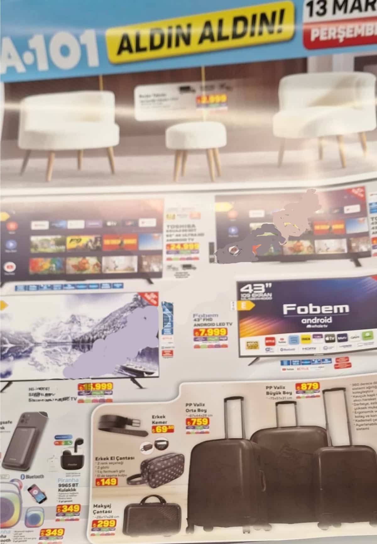 A101’in 13 Mart kataloğunun ilk sayfasında elektronik ve teknoloji ürünleri dikkat çekiyor. Bu kapsamda Toshiba ve Onvo markalı televizyonlar uygun fiyatlarla satışa sunulacak: