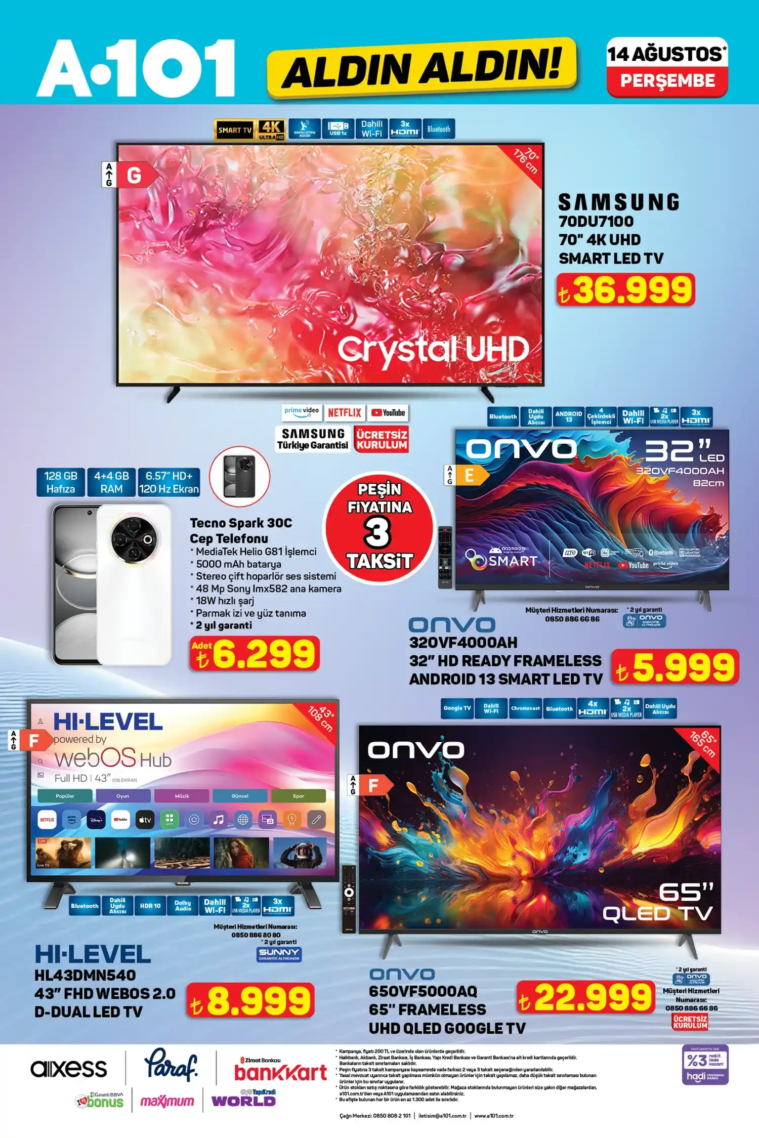 Bu haftanın ilk sayfası televizyon indirimleriyle açılıyor. 4 farklı TV modeli Sivas’taki A101 raflarında yerini alıyor.