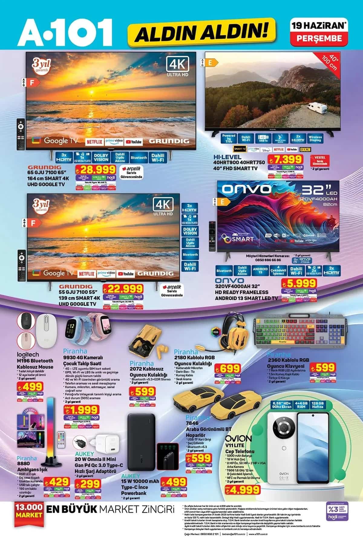 Kataloğun ilk sayfasında dikkat çeken ürünler arasında TOSHIBA 65" 4K UHD Android TV 25.999 TL, TOSHIBA 55" 4K UHD Vıdaa TV ise 16.999 TL’den satışa çıkıyor. Fobem 43” FHD Android Led TV 8.499 TL, Samsung 70” 4K UHD Smart TV ise 36.999 TL fiyatıyla raflardaki yerini alacak. Ayrıca, Piranha Bluetooth kulaklıklar ve Homotech Alfa 520C Notebook (6.499 TL) gibi ürünler teknoloji severler için öne çıkıyor.