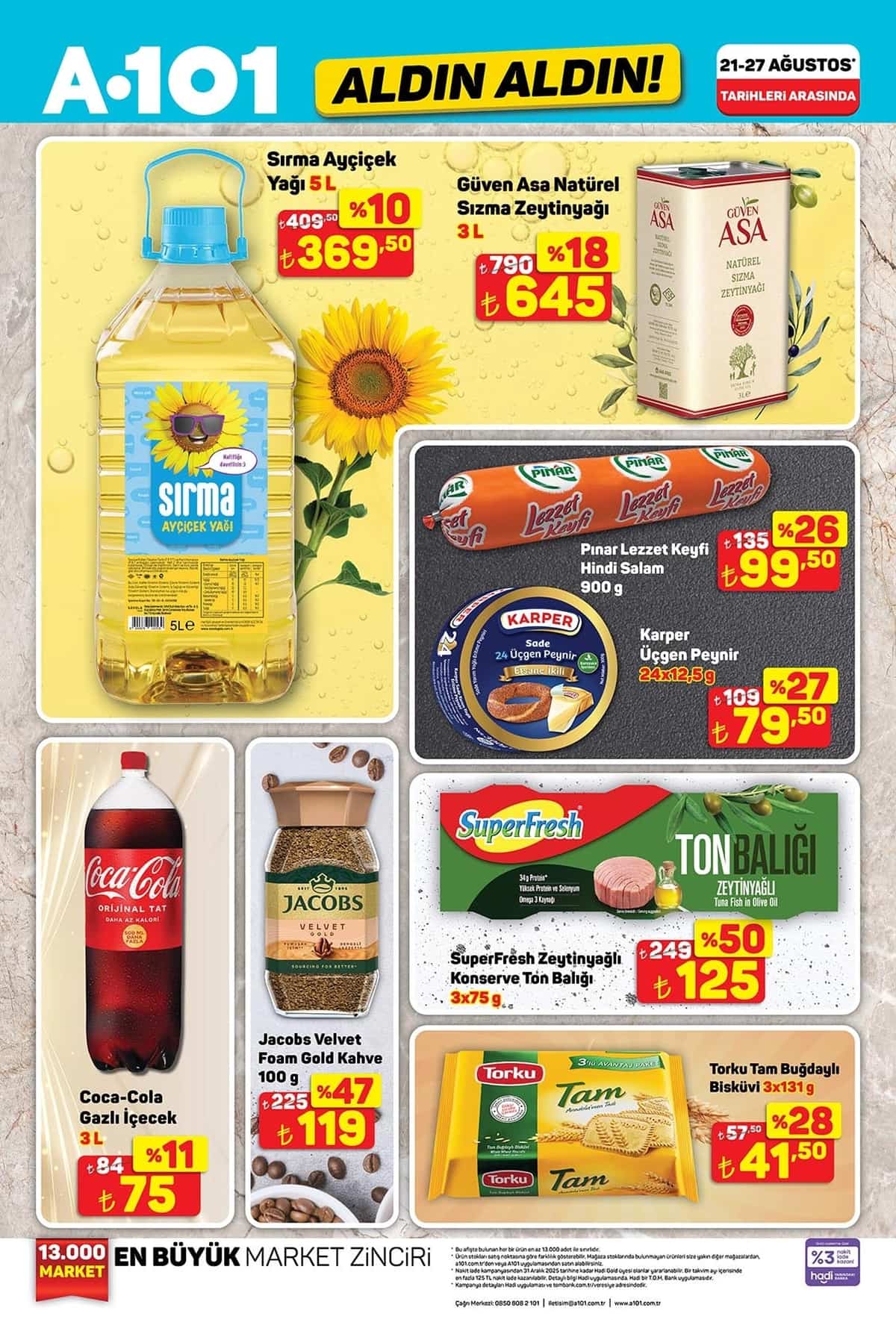 Türkiye’nin en büyük market zinciri olan A101, enflasyonla mücadele kapsamında uyguladığı “Aldın Aldın” kampanyasını bu haftada sürdürüyor. A101 şubeleri ile birlikte A101 Online ve A101 Kapıda seçenekleri üzerinden de ulaşabileceğiniz kampanyalı ürünler 28 Ağustos 2025 tarihine kadar satışta olacak.