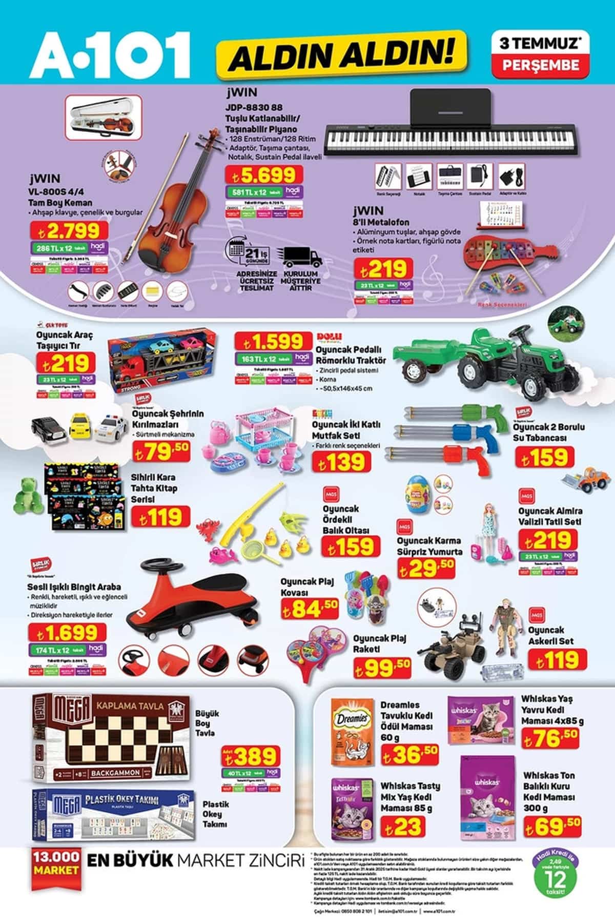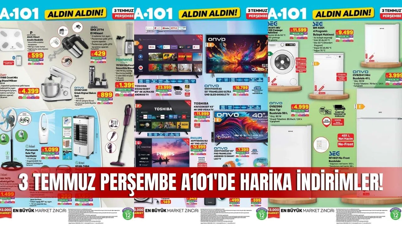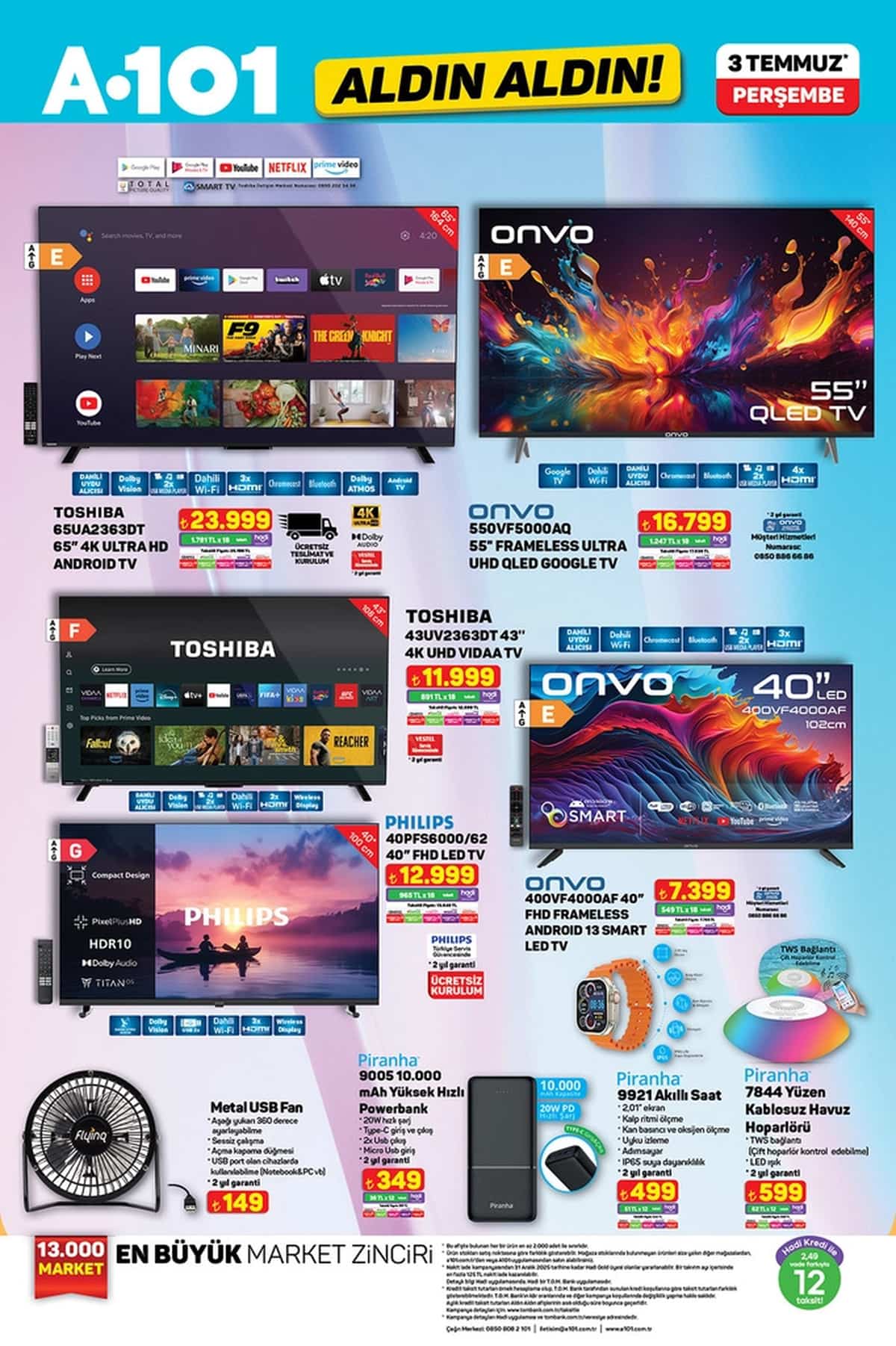 A101 3 Temmuz 2025 Kataloğunun ilk sayfasında teknoloji ürünleri öne çıkıyor. Özellikle ONVO ve TOSHIBA markalı televizyonlar dikkat çekiyor. 2 yıl garantili, Google işletim sistemine sahip 55” Onvo Qled Google TV 16.799 TL fiyatla satışta. Ayrıca Toshiba 65” 4K Android TV 23.999 TL, Philips 40” FHD Led TV ise ücretsiz kurulumla 12.999 TL’den alıcı bekliyor. Piranha markasına ait powerbank, akıllı saat ve kablosuz hoparlör gibi ürünler de uygun fiyatlarıyla dikkat çekiyor.