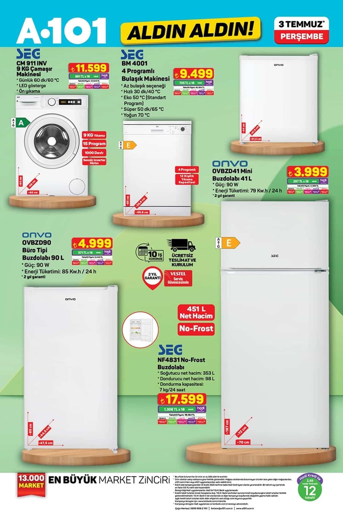 Sivas’taki A101 şubelerinde bu hafta SEG markalı beyaz eşyalar öne çıkıyor. 9 KG kapasiteye sahip çamaşır makinesi 11.599 TL, 12 kişilik bulaşık makinesi 9.499 TL, 451 litre hacimli No-Frost buzdolabı ise 17.599 TL’den satışta. Ayrıca Onvo marka mini buzdolabı da sadece 3.999 TL.