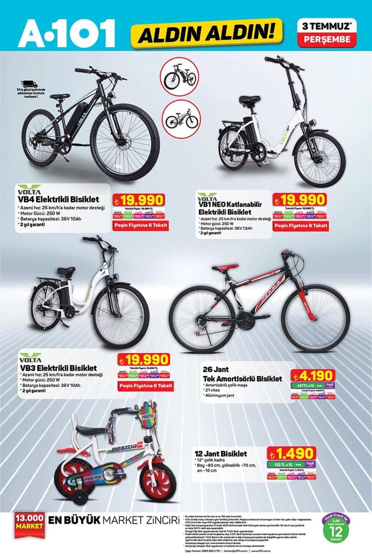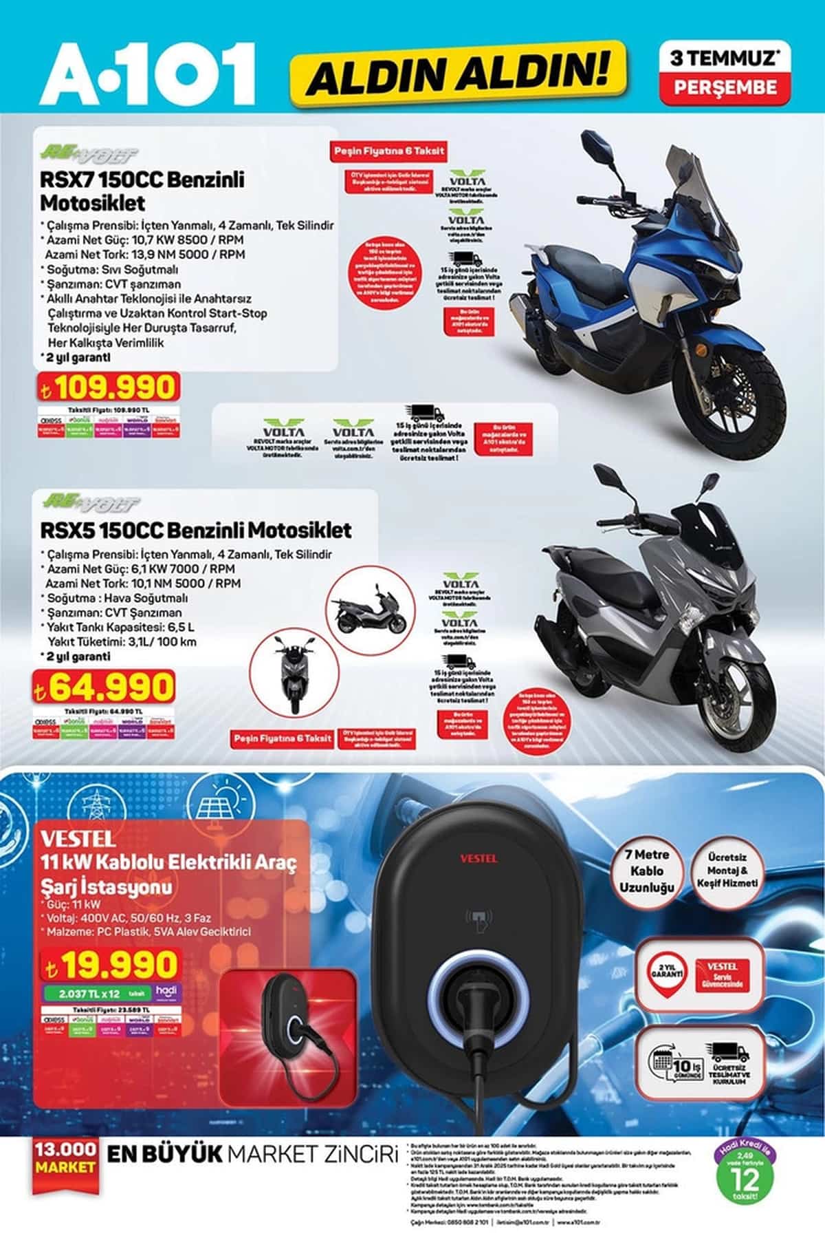 Bu hafta A101’de Volt ve Volta markalı motosiklet ve elektrikli bisiklet modelleri de yer alıyor. RSX5 benzinli motosiklet 64.990 TL, VB4 elektrikli bisiklet 19.990 TL. Ayrıca Vestel marka elektrikli araç şarj istasyonu da 19.990 TL’ye satışta.
