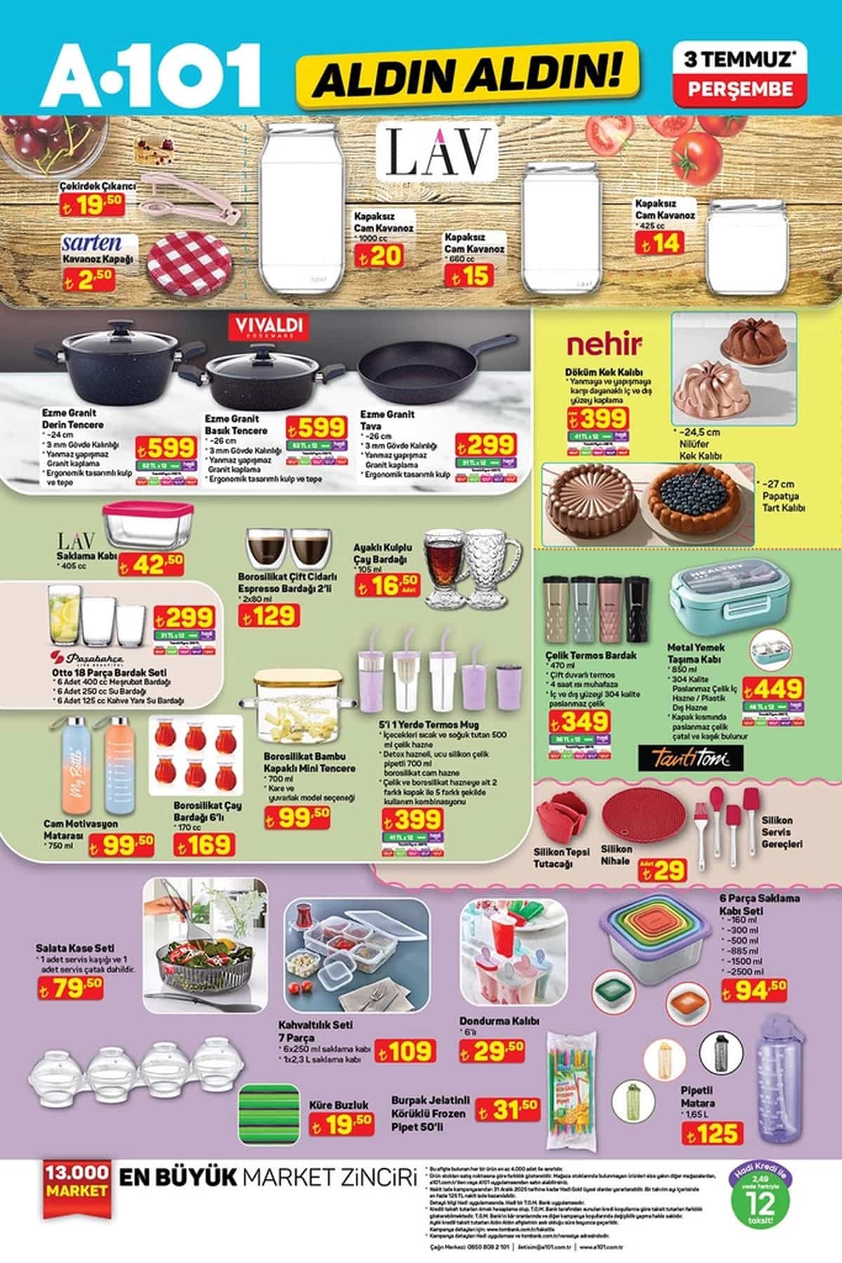 A101 3 Temmuz kataloğunda mutfak ürünleri de unutulmadı. Vivaldi granit tencere ve tavalar, çelik termos bardaklar, salata kasesi setleri ve daha birçok züccaciye ürünü Sivas şubelerinde büyük ilgi görüyor. Özellikle 6’lı Borosilikat çay bardağı seti 169 TL fiyatıyla öne çıkıyor.