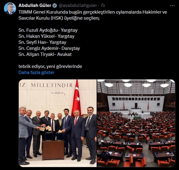 Abdullah Güler'in paylaşımına göre, yargının tepe noktalarından ve hukuk camiasından gelen önemli isimler HSK üyeliğine seçildi. Güler, yaptığı açıklamada şu ifadelere yer verdi: