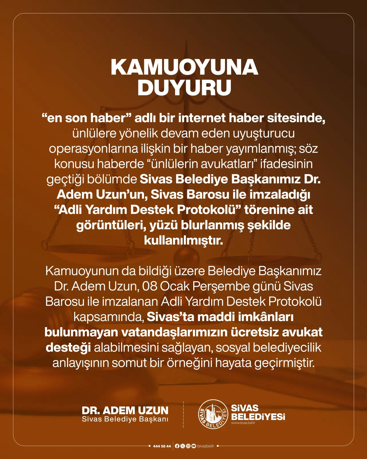“en son haber” adlı bir internet haber sitesinde, ünlülere yönelik devam eden uyuşturucu operasyonlarına ilişkin bir haber yayımlanmış; söz konusu haberde “ünlülerin avukatları” ifadesinin geçtiği bölümde Sivas Belediye Başkanımız Dr. Adem Uzun’un, Sivas Barosu ile imzaladığı “Adli Yardım Destek Protokolü” törenine ait görüntüleri, yüzü bulanmış şekilde kullanılmıştır."