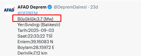 AFAD’ın verilerine göre, 3,7 (Mw) büyüklüğündeki deprem 3 Eylül 2025 tarihinde saat 22:33’te kaydedildi. Depremin yerin yaklaşık 7,12 kilometre derinliğinde gerçekleştiği bildirildi.