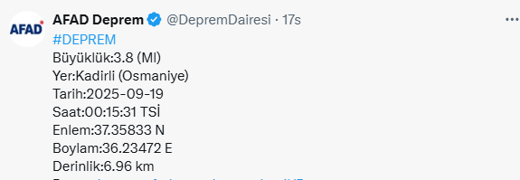 Afet ve Acil Durum Yönetimi Başkanlığı (AFAD), 19 Eylül 2025 tarihinde saat 00.15’te Osmaniye’nin Kadirli ilçesinde 3,8 büyüklüğünde bir deprem meydana geldiğini duyurdu. Depremin merkez üssü Kadirli olurken, sarsıntının yerin yaklaşık 6,96 kilometre derinliğinde gerçekleştiği bildirildi.