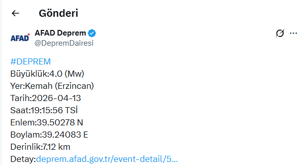 Afet ve Acil Durum Yönetimi Başkanlığı (AFAD), Erzincan’ın Kemah ilçesinde 4,0 büyüklüğünde bir depremin meydana geldiğini duyurdu. Deprem, 13 Nisan 2026 tarihinde saat 19:15:56’da kaydedildi.