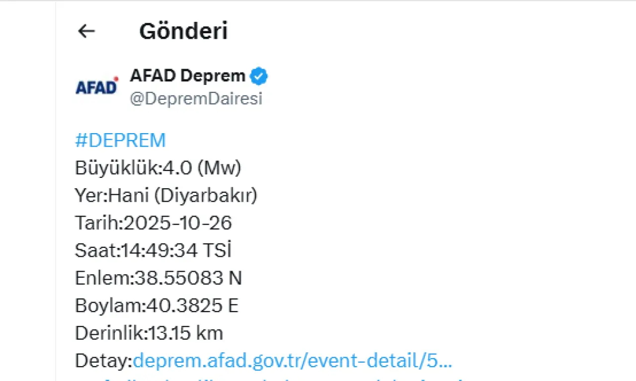 Afet ve Acil Durum Yönetimi Başkanlığı (AFAD), Diyarbakır’ın Hani ilçesinde 4,0 büyüklüğünde bir deprem meydana geldiğini duyurdu.