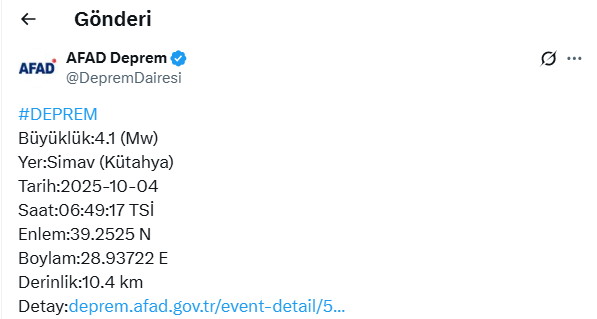 Kütahya’nın Simav ilçesinde sabah saatlerinde korkutan bir deprem meydana geldi. AFAD’ın resmi verilerine göre, 4,1 (Mw) büyüklüğündeki deprem saat 06:49:17’de (TSİ) kaydedildi. Depremin merkez üssü Simav (Kütahya) olarak belirlenirken, 10.4 kilometre derinlikte gerçekleştiği bildirildi.