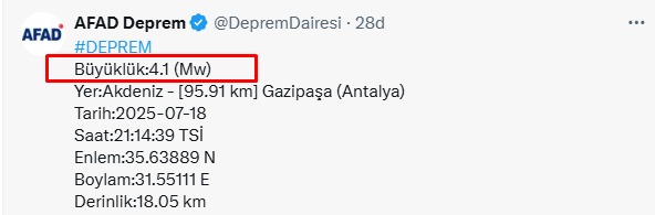 AFAD'ın son açıklamasına göre, Akdeniz'de 4.1 büyüklüğünde bir deprem meydana geldi. Deprem, Antalya'nın Gazipaşa ilçesine yaklaşık 95.91 km uzaklıkta, 35.63889 N enlemi ve 31.55111 E boylamında kaydedildi. Depremin derinliği 18.05 km olarak ölçülürken, yerel saatle 21:14:39'da gerçekleşti.