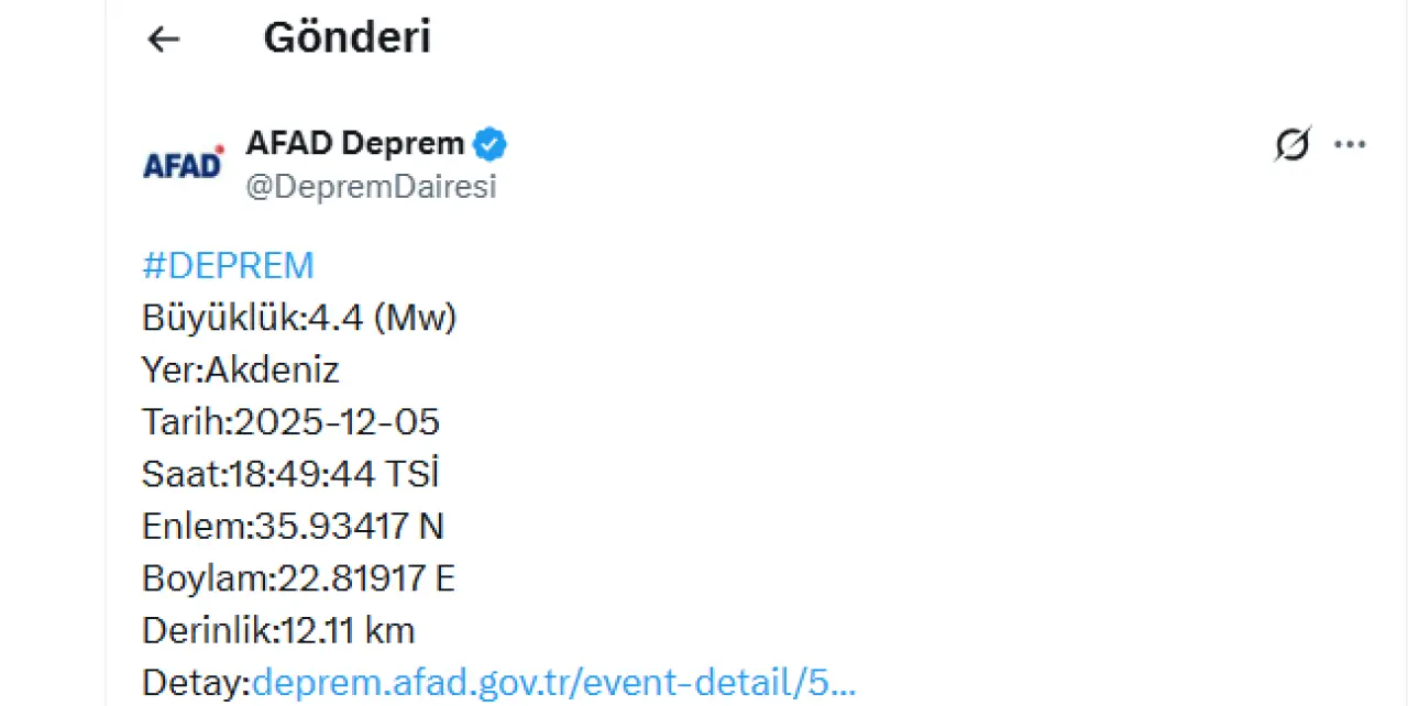 AFAD tarafından yapılan açıklamaya göre 4,4 büyüklüğünde deprem meydana geldi. Resmî verilere göre depremin merkez üssü Akdeniz açıkları olarak bildirilirken, derinliğinin 12.11 km olduğu ifade edildi. Deprem kısa süreli paniğe neden olsa da bölgede şu ana kadar olumsuz bir ihbar bulunmadığı belirtiliyor.