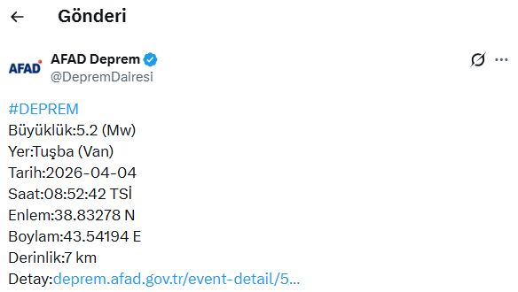 Afet ve Acil Durum Yönetimi Başkanlığı (AFAD), Van’ın Tuşba ilçesinde meydana gelen 5,2 büyüklüğündeki depremi kamuoyuna duyurdu. Sabah saatlerinde gerçekleşen sarsıntı, bölgede kısa süreli paniğe neden oldu.
